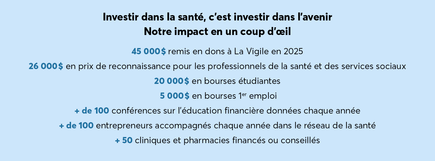 Chaque année, ce sont des milliers de dollars que nous redistribuons dans votre milieu. Nous connaissons vos défis et vos enjeux quotidiens et c’est pourquoi nous cherchons à soutenir des projets qui bénéficient aux étudiants, professionnels et entreprises du milieu de la santé.